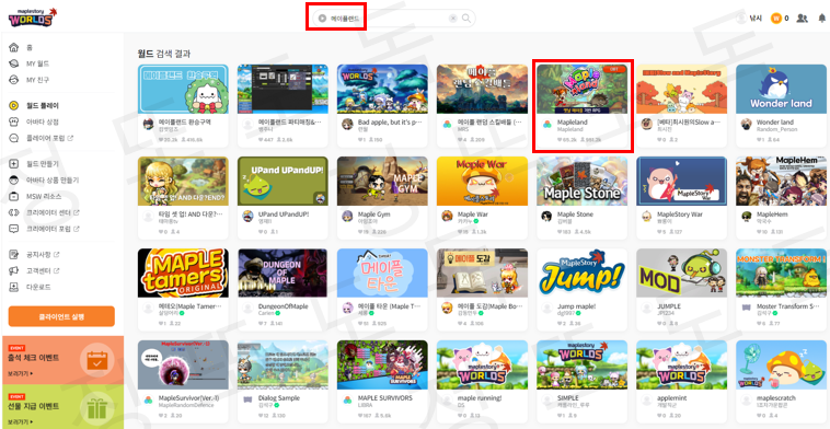메이플월드 검색창에 메이플랜드를 검색해 주세요.