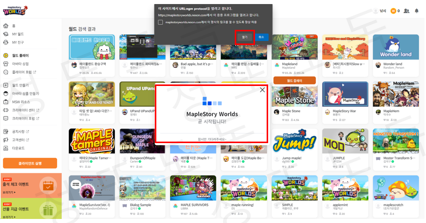 우선 네이버에서 메이플월드를 검색한 후 홈페이지에 접속해 주세요.